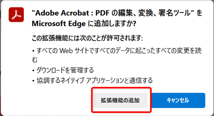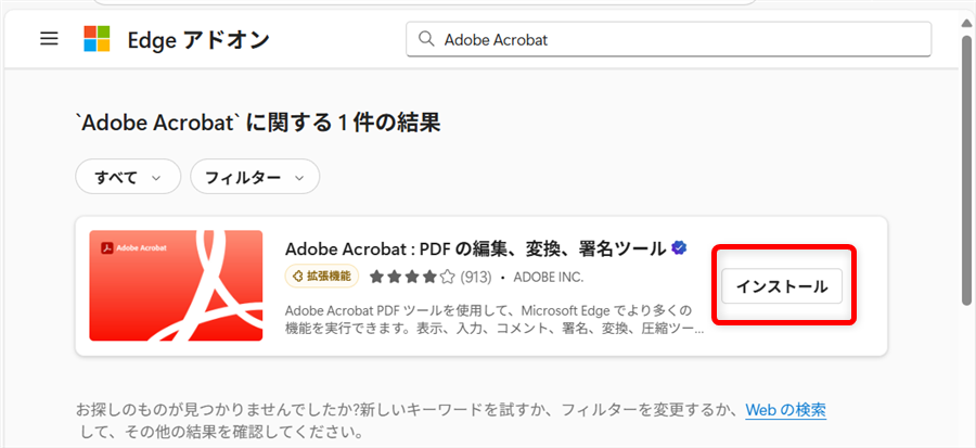 これで、Microsoft EdgeにAdobe Acrobatの拡張機能をインストールすることができます。