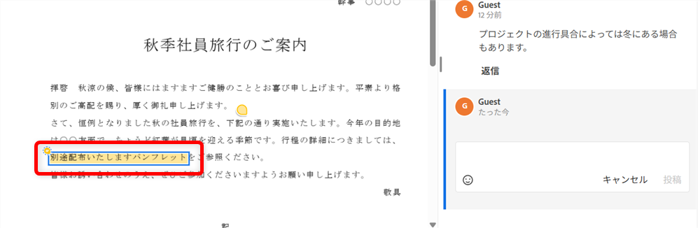 コメントを追加したい部分をクリックすると、吹き出しマークが現れます。