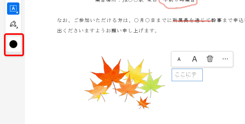 ツールバーの黒色をクリックするとテキストの色を変えられます。