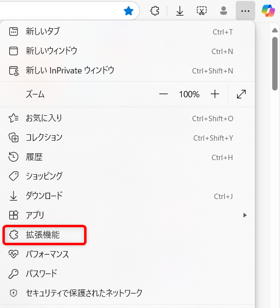 【Microsoft Edgeの拡張機能】翻訳を簡単に!Simple Translateの使い方と設定方法「メニュー」から「拡張機能」を選択します。