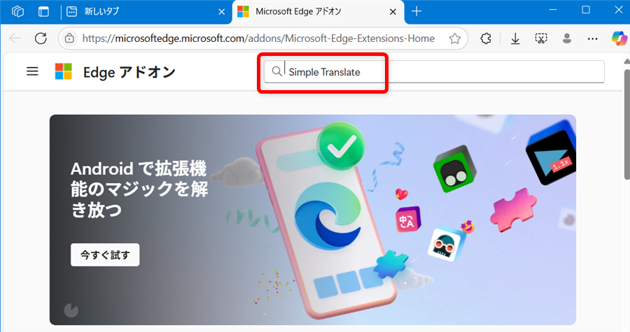 【Microsoft Edgeの拡張機能】翻訳を簡単に!Simple Translateの使い方と設定方法検索ボックスに「Simple Translate」と入力します。