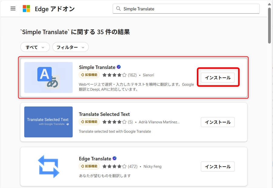 【Microsoft Edgeの拡張機能】翻訳を簡単に!Simple Translateの使い方と設定方法一番上の段のSimple Translateのインストールボタンを押します。
