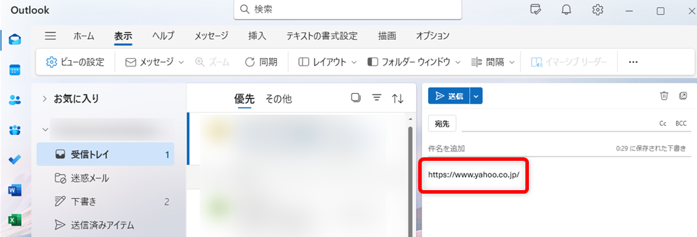 Outlook for Windowsのメールの形式が、プレーンテキストになっていると、URLをハイパーリンクにすることができないので、HTML形式に変更することが必要です。