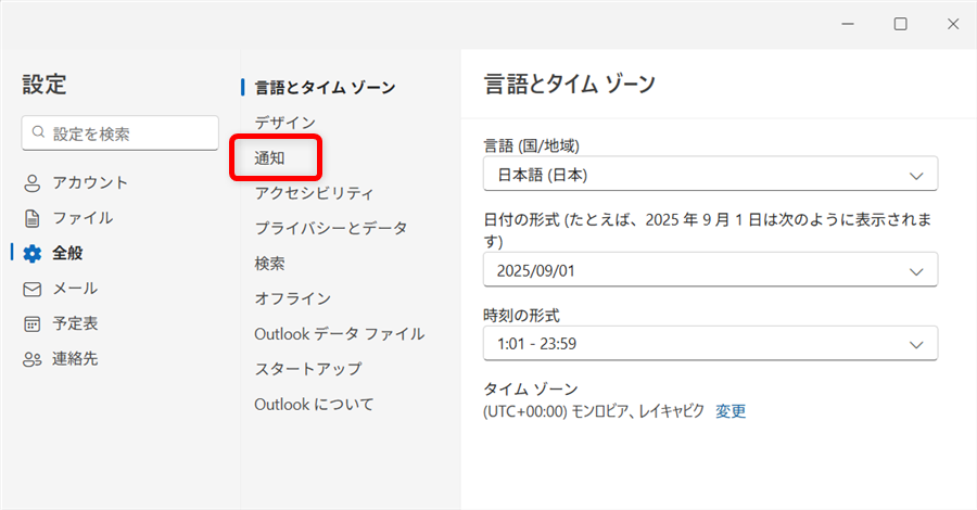 「言語とタイムゾーン」の中の「通知」を選択します。