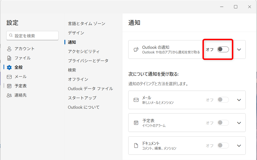 「Outlookの通知」が「オフ」になっていると、全体の通知が来ません。
