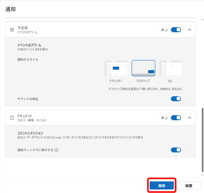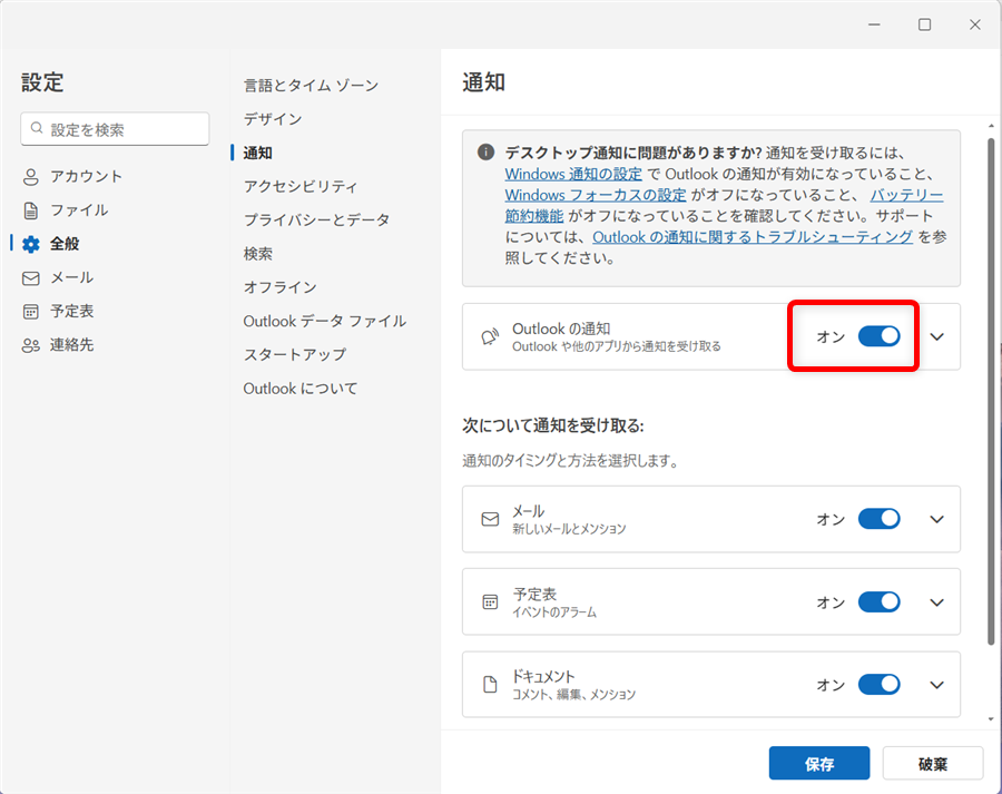 これで、Outlook for Windowsの通知設定を変更することができます。