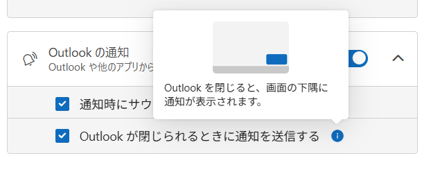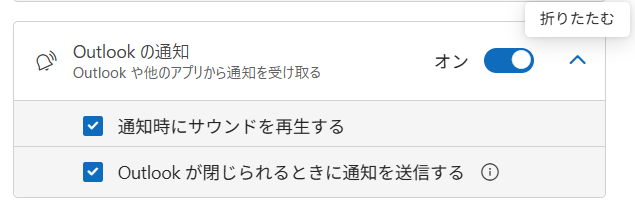 「通知時にサウンドを再生する」、「Outlookが閉じられるときに通知を送信する」の設定ができます。