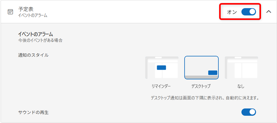 「次について通知を受け取る」の「予定表」では、「イベント」の通知や「サウンドの再生」の通知を受け取ることができます。