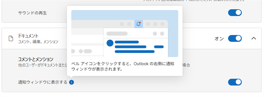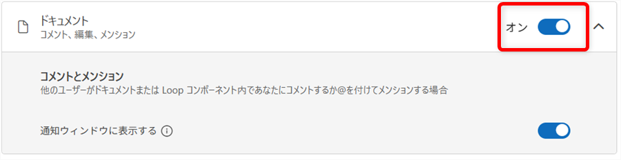 「ドキュメント」にある「通知ウィンドウを表示する」を「オン」にすると、トップページにあるベルのマークをクリックすれば、右側に通知されます。