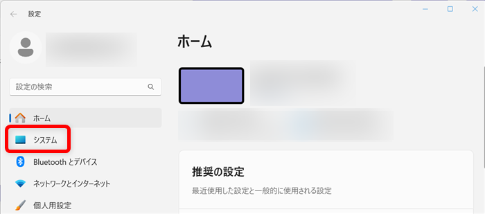 左側の「メニュー」から「システム」を選択します。