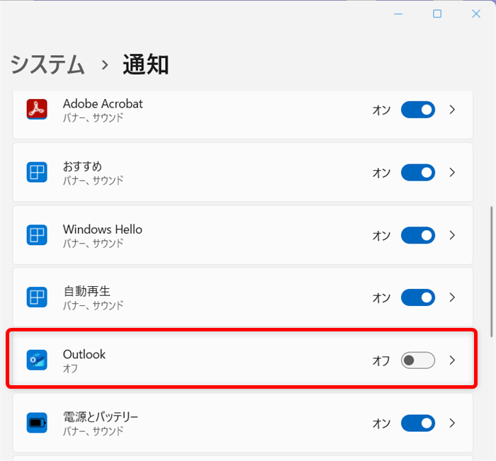 この場合は、Windows 11で、Outlook for Windowsの通知をオンにする必要があるので、その方法をご紹介します。