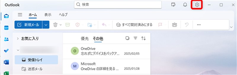 Outlook for Windowsを開き、画面上部の歯車のマークを選択して「設定メニュー」を開きます。