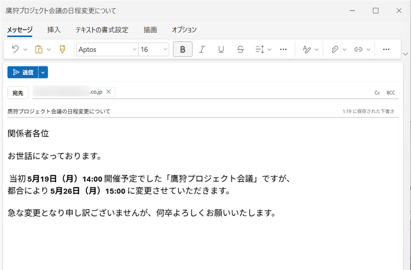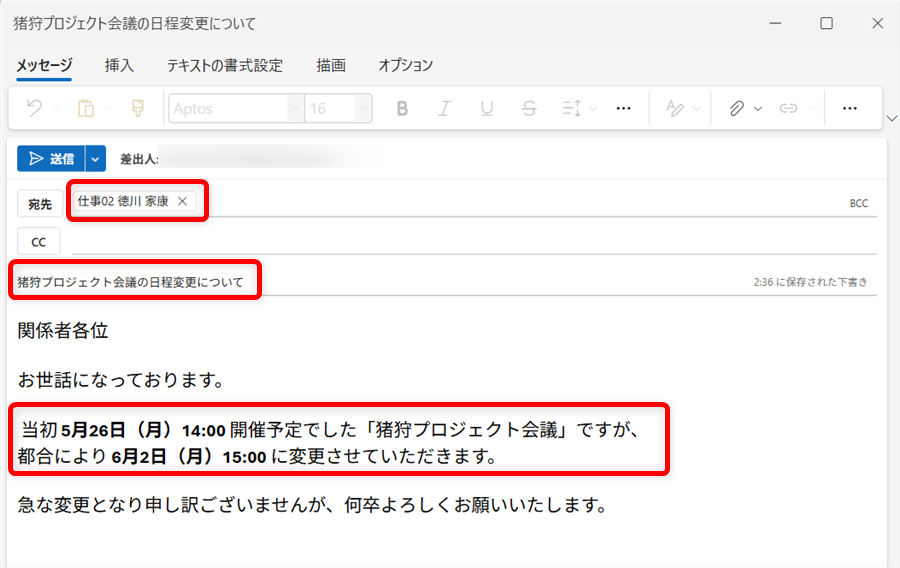 【Outlook for Windows】予約送信のやり方|オフライン送信の可否やバレる可能性も解説件名と本文を修正しました。