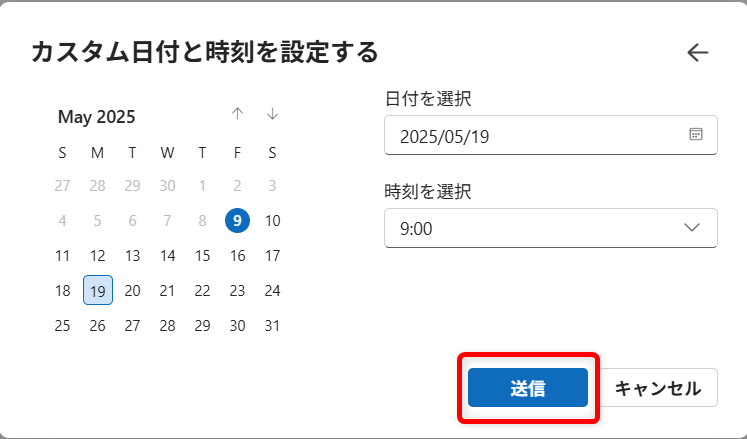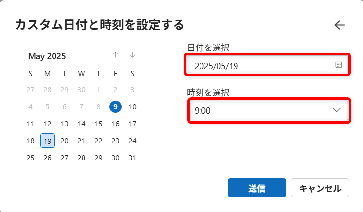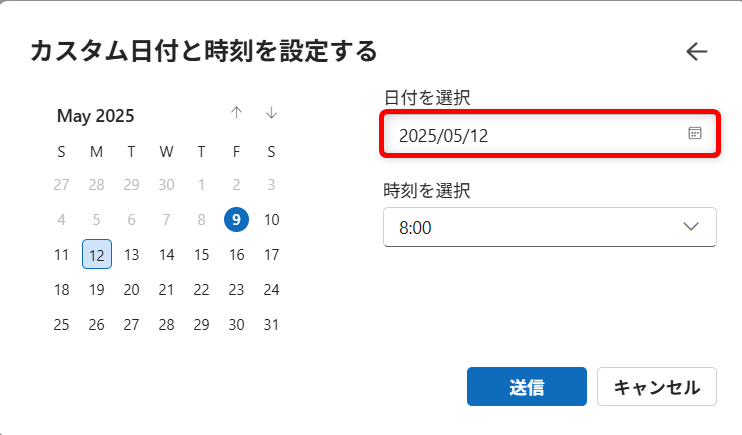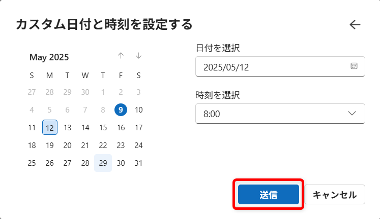 【Outlook for Windows】予約送信のやり方|オフライン送信の可否やバレる可能性も解説カレンダーで変更する日付と時刻を選択します。