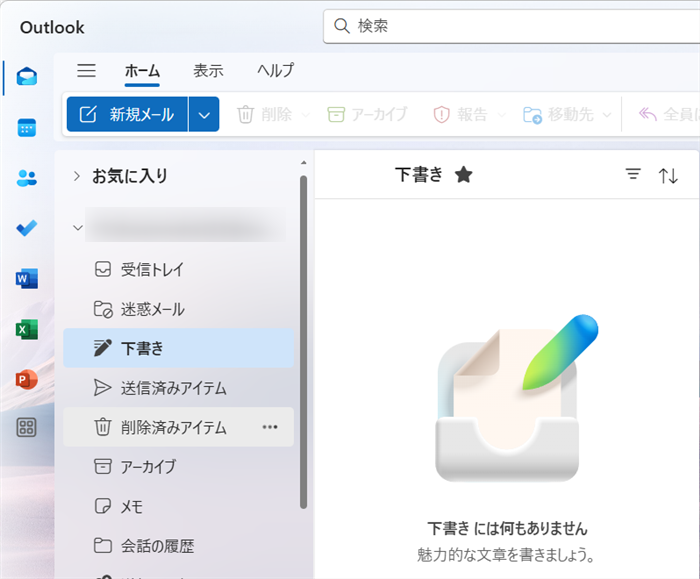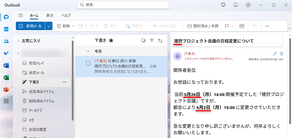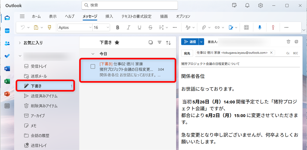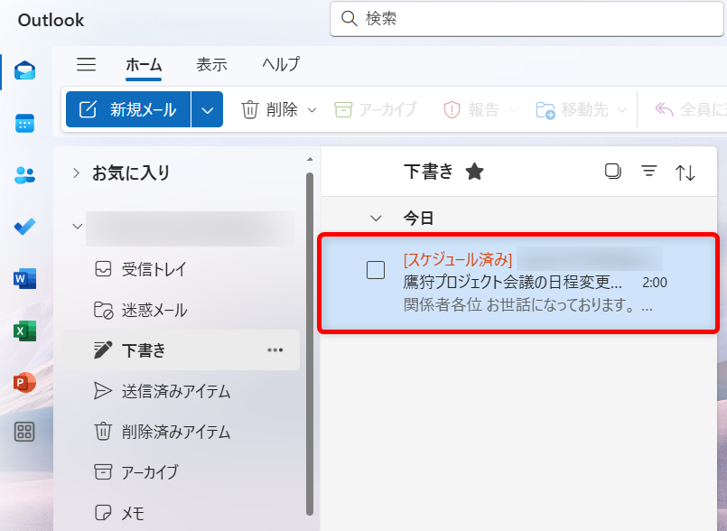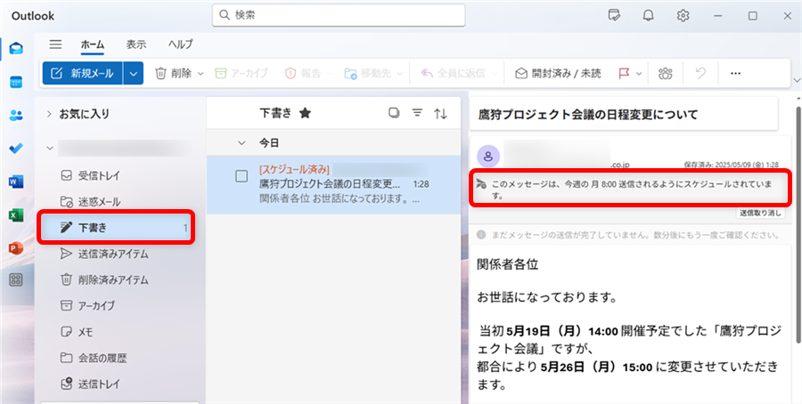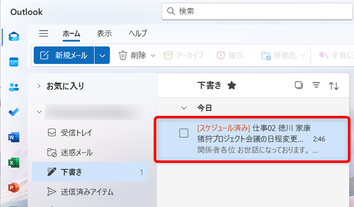 【Outlook for Windows】予約送信のやり方|オフライン送信の可否やバレる可能性も解説メールに[下書き]と表示され、下書きフォルダに保存されます。