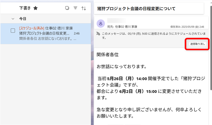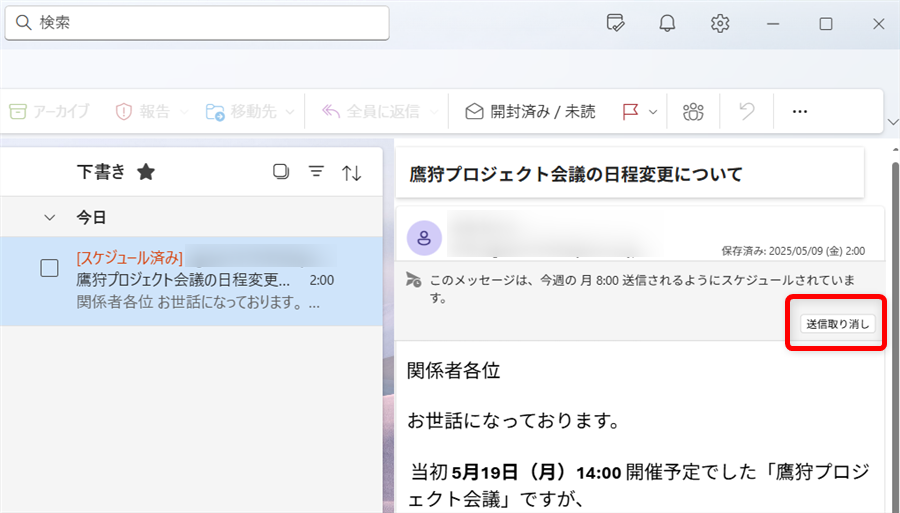 これで、Outlook for Windowsで予約送信したメールの修正ができます。