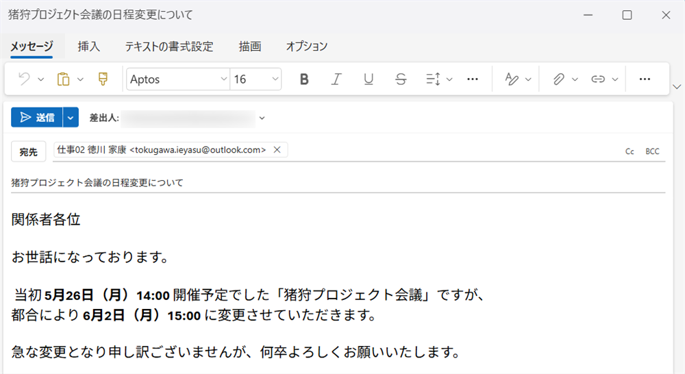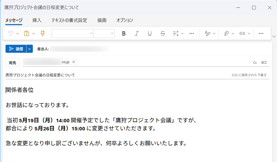【Outlook for Windows】予約送信のやり方|オフライン送信の可否やバレる可能性も解説宛先、件名、本文を作成します。