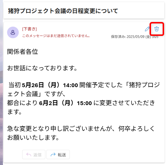 【Outlook for Windows】予約送信のやり方|オフライン送信の可否やバレる可能性も解説メールを削除したい場合、メールの編集画面のゴミ箱のマークをクリックします。