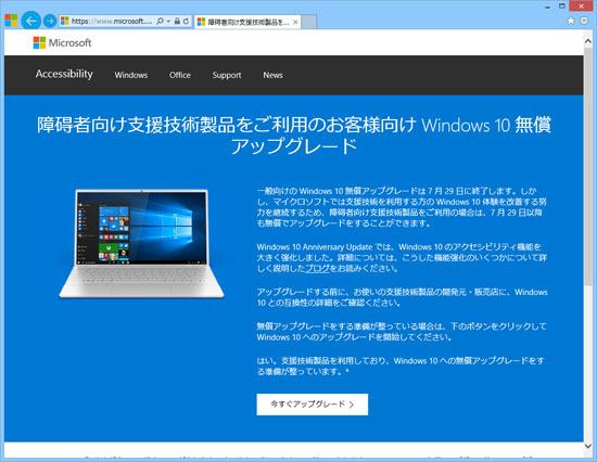 マイクロソフトのサイトでも「障碍者向け支援技術製品をご利用の場合は、2016年7月29日以降も無償でアップグレードをすることができます」と表記されています。