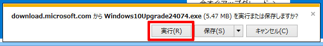 Internet Explorerの場合、「download.microsoft.com から Windows10Upgrade24074.exe(5.47MB)を実行または保存しますか?」と表示されますので、「実行」をクリックします。