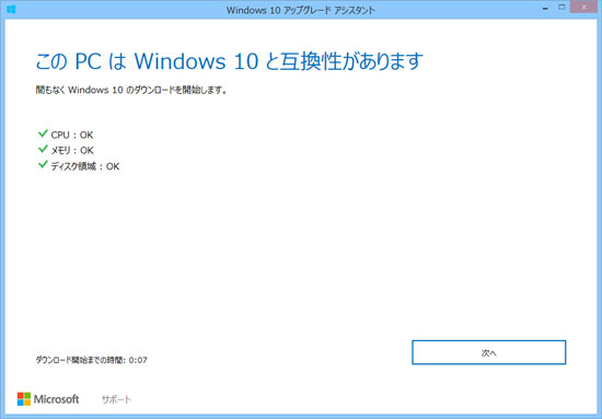 「このPCはWindows 10 と互換性があります」が表示されます。