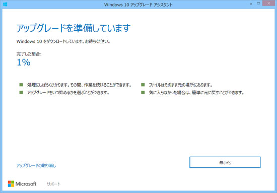 ※実際には「障碍者向け支援技術製品をご利用のお客様向け」の無償アップグレードをしたパソコンは、Windows 8.1の状態で残しておきたいため、インストールが完了する前に強制終了しました。