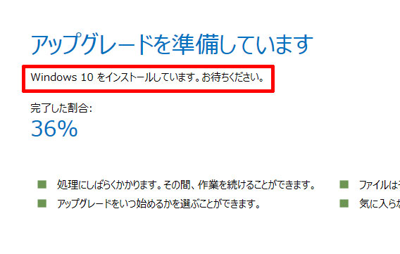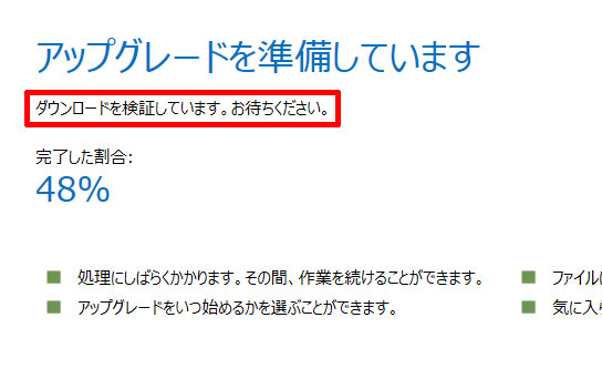 ダウンロードの検証が終わると「Windows 10 をインストールしています。お待ちください。」が表示されます。
