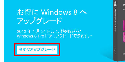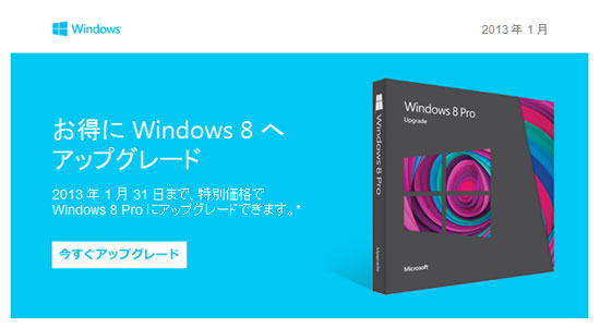 「お得にWindows 8へアップグレード」「2013年1月31日まで、特別価格でWindows 8 Proにアップグレードできます」という内容です。