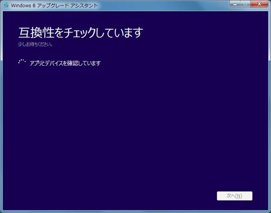 アップグレードアシスタントが起動し「互換性をチェックしています」「少々お待ちください。」が表示されます。