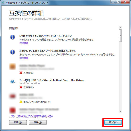 「互換性の詳細」にソフトごとの互換性の有無が表示されます。