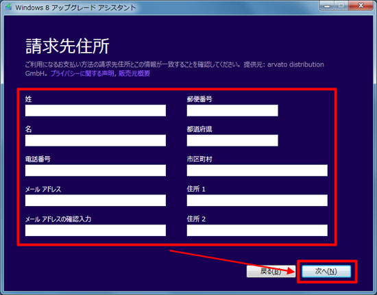 「請求先住所」で、個人情報を入力→「次へ」をクリックします。
