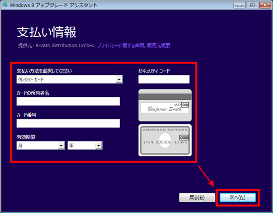 「支払情報」で、クレジットカードの情報を入力→「次へ」をクリックします。