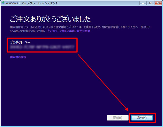 「ご注文ありがとうございました」にWindows 8のインストールに必要な「プロダクトキー」が表示されますので、メモをするなどして保管してください。