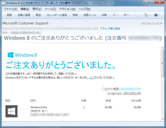 「Windows 8のご注文ありがとうございました」という件名のメールが届きます。