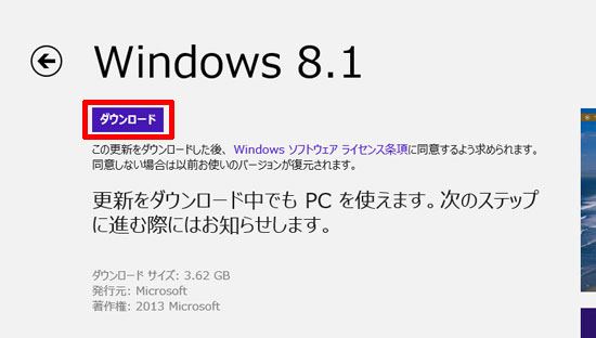 Windows 8.1の画面で「ダウンロード」をクリックします。
